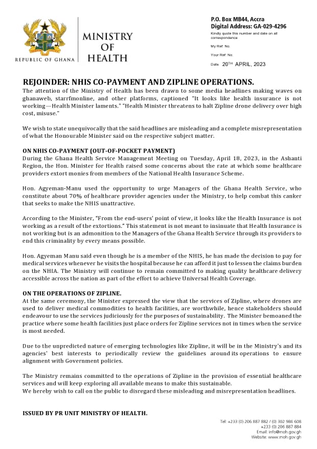 “The Ministry remains committed to the operations of Zipline in the provision of essential healthcare services and will keep exploring all available means to make this sustainable. We hereby wish to call on the public to disregard these misleading and misrepresentation headlines”.