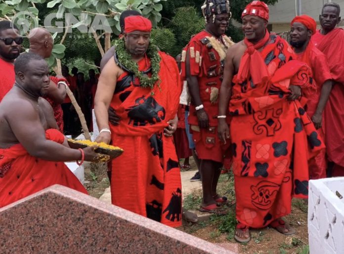 King Tackie Teiko Tsuru II, the Ga Mantse, Saturday, performed the Sprinkling of Kpoikpoi customs at the royal mausoleum in Tesano, Accra, as part of the 2022 Homowo festivities.