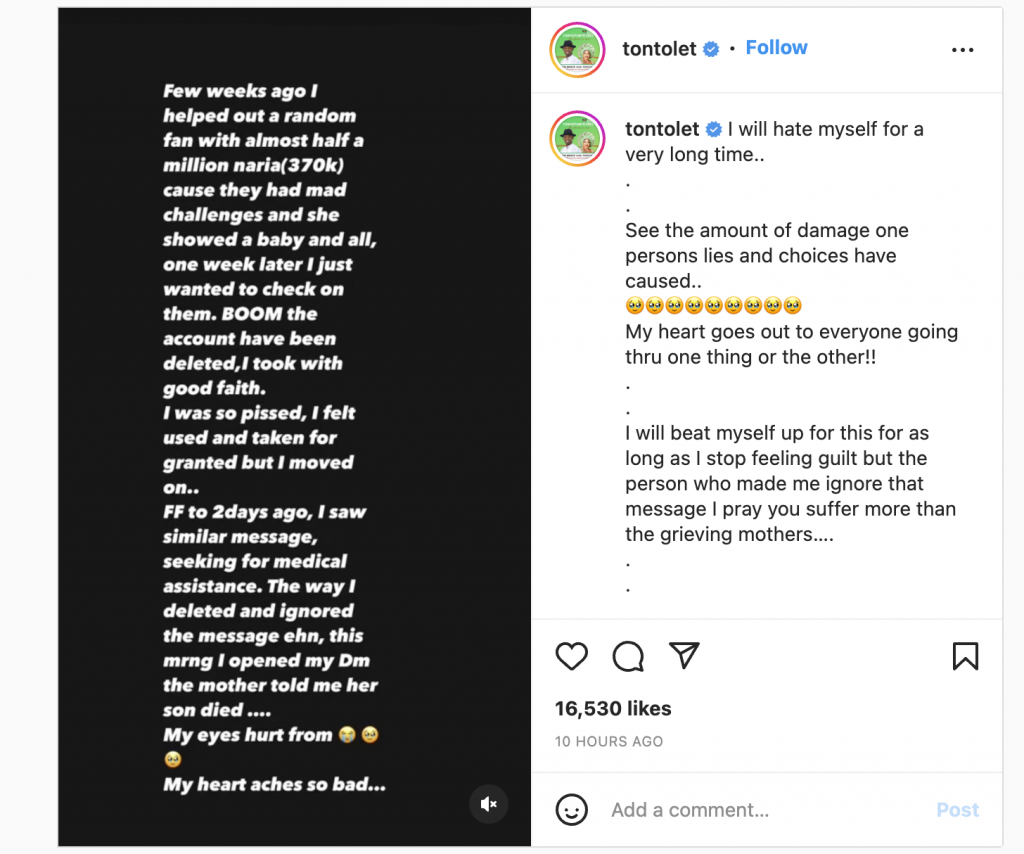 Actress Tonto Dikeh is overwhelmed with guilt as a fan she refused to help loses son.Tonto poured out her heart on Instagram, says she’ll hate herself for a very long time.She believes it will be difficult for her to overcome the guilt of the boy’s death.