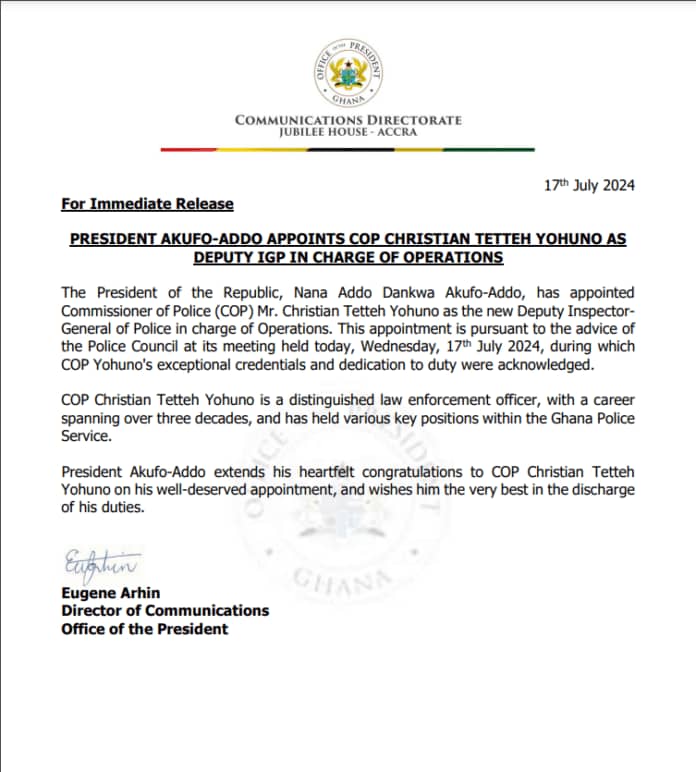 On Wednesday, July 17th, the appointment of COP Yohuno was announced in a press statement released by Mr. Eugene Arhin, Director of Communications at the Presidency.