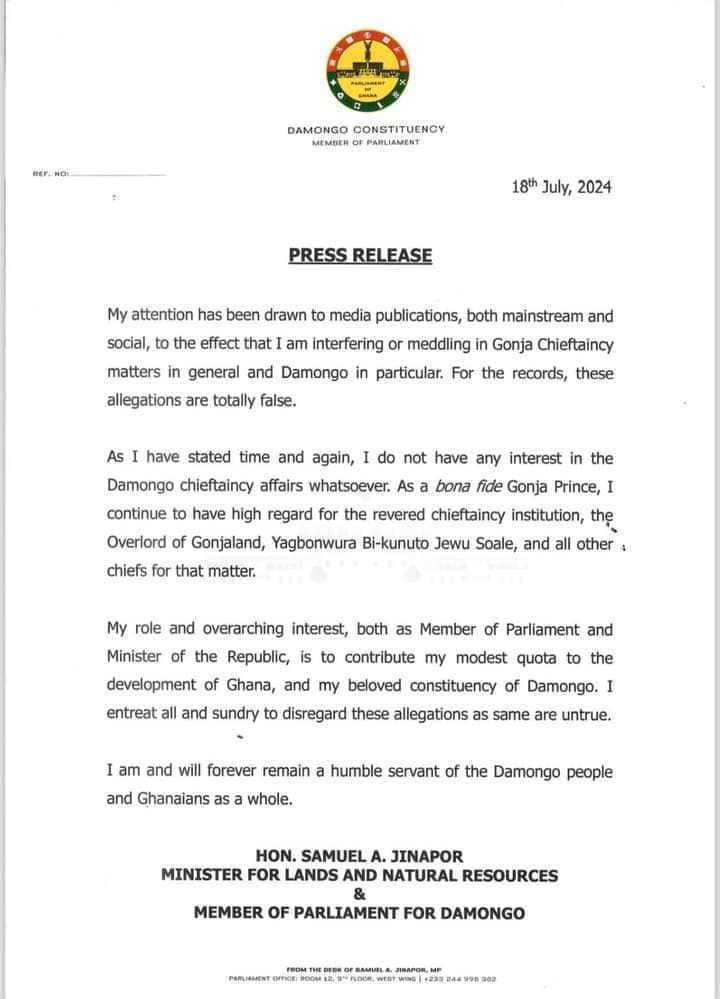 In a statement, he said “My attention has been drawn to media publications, both mainstream and social, to the effect that I am interfering or meddling in Gonja Chieftaincy matters in general and Damongo in particular. For the records, these allegations are totally false.