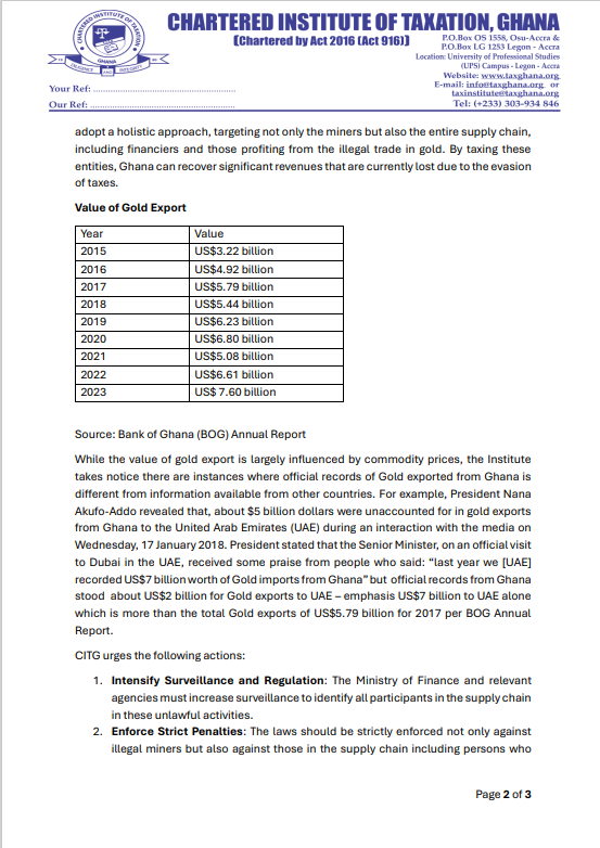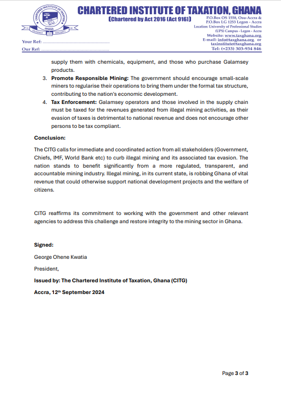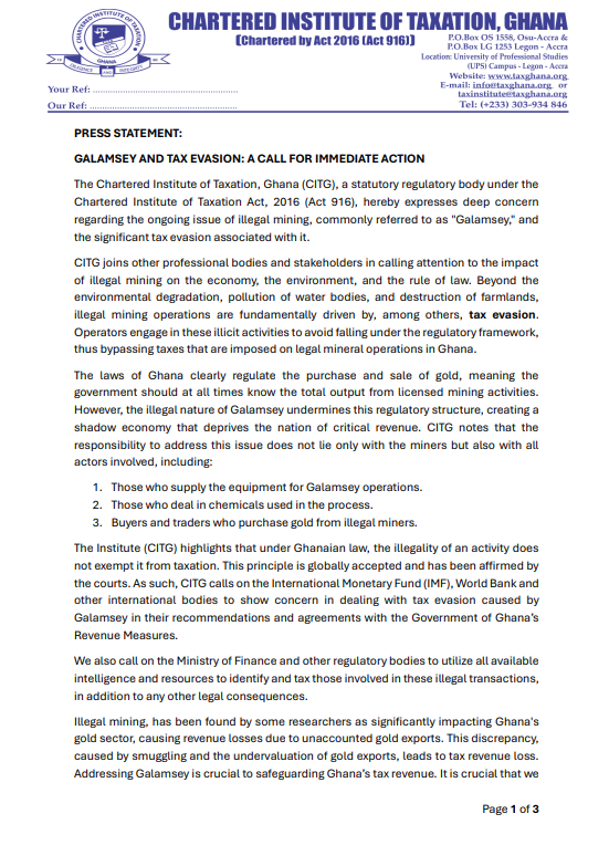 CITG also called on the International Monetary Fund (IMF), World Bank, and other global organizations to address tax evasion from galamsey in their discussions with the Government of Ghana.
