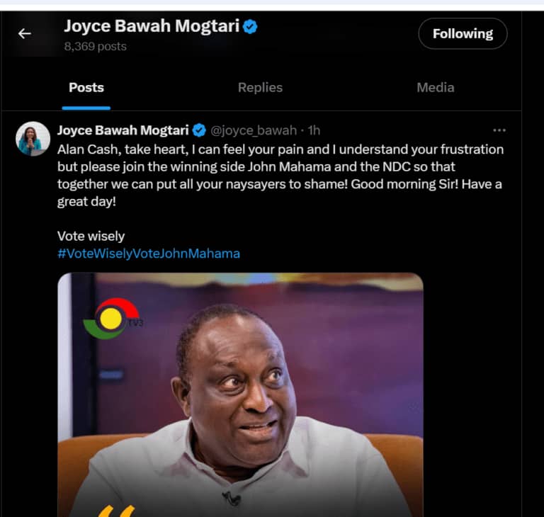 She emphasized that joining forces with Mahama would not only help silence critics but also bolster Kyerematen’s position in the race. “Alan Cash, take heart, I can feel your pain and I understand your frustration, but please join the winning side, John Mahama and the NDC, so that together we can put all your naysayers to shame! Good morning Sir! Have a great day!” Bawah Mogtari wrote.