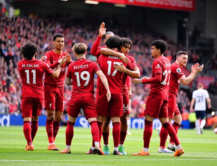 A chaotic first half was only three minutes old when Curtis Jones put the hosts in front and two minutes later Tottenham’s defence crumbled again as Luis Diaz volleyed home.
