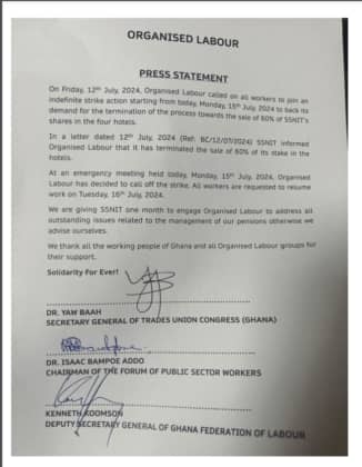 “On Friday the 12th of July 2024 organized labour called on all workers to join an indefinite strike starting today Monday 15th of July 2024 to back our demand for the termination of the process towards the stake of 60 of SSNIT shares on the four hotels.