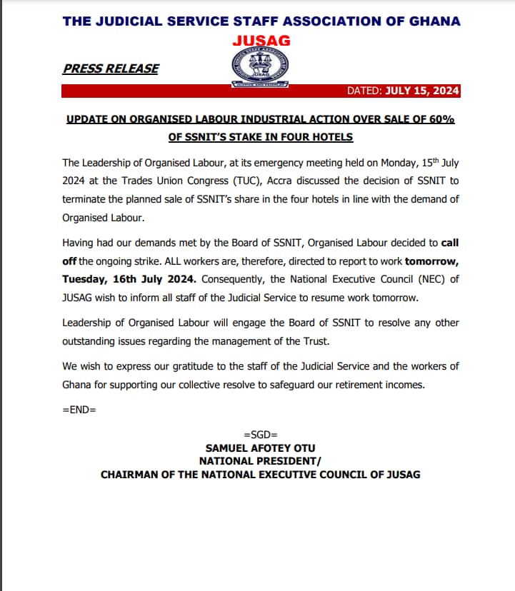 JUSAG stated, “Following the fulfillment of our demands by the SSNIT Board, Organised Labour has opted to end the current strike.