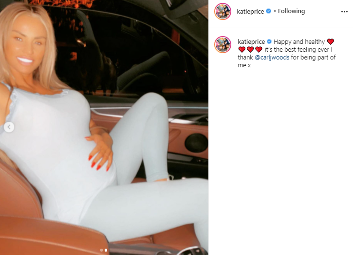 In the caption, Price appeared to hint that she and her boyfriend Carl Woods are expecting their first child together, writing: “Happy and healthy. It’s the best feeling ever I thank @carljwoods for being part of me xx.”