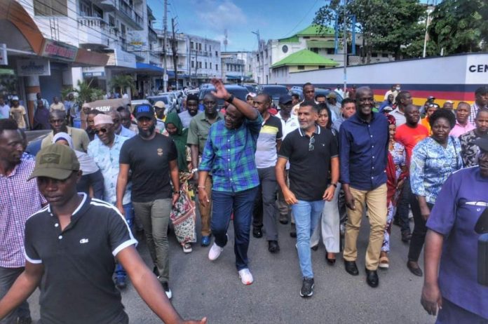 He came out of a restaurant and shook hands with the public as he walked on the streets alongside the outgoing and incoming governors.