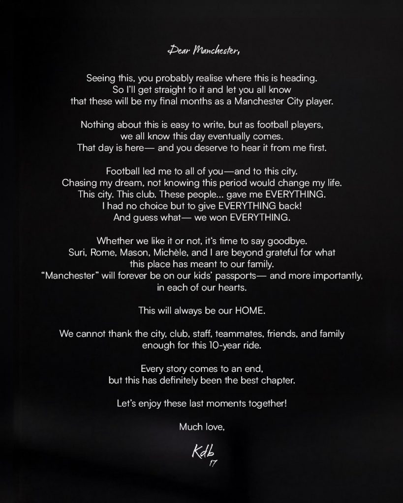 Kevin De Bruyne has announced he will leave Manchester City at the end of the current season, closing the chapter on a glittering 10-year career at the Etihad Stadium.