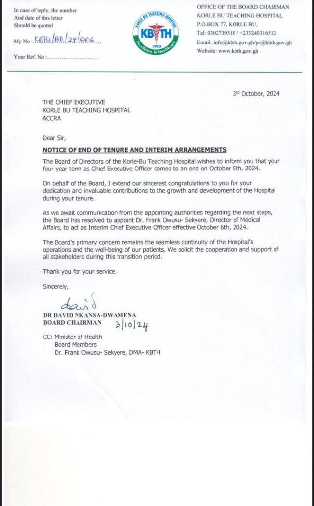The Board of Directors of Korle Bu Teaching Hospital (KBTH) has announced that Dr. Opoku Ware Ampomah’s four-year term as Chief Executive Officer (CEO) will come to an end on October 5, 2024.