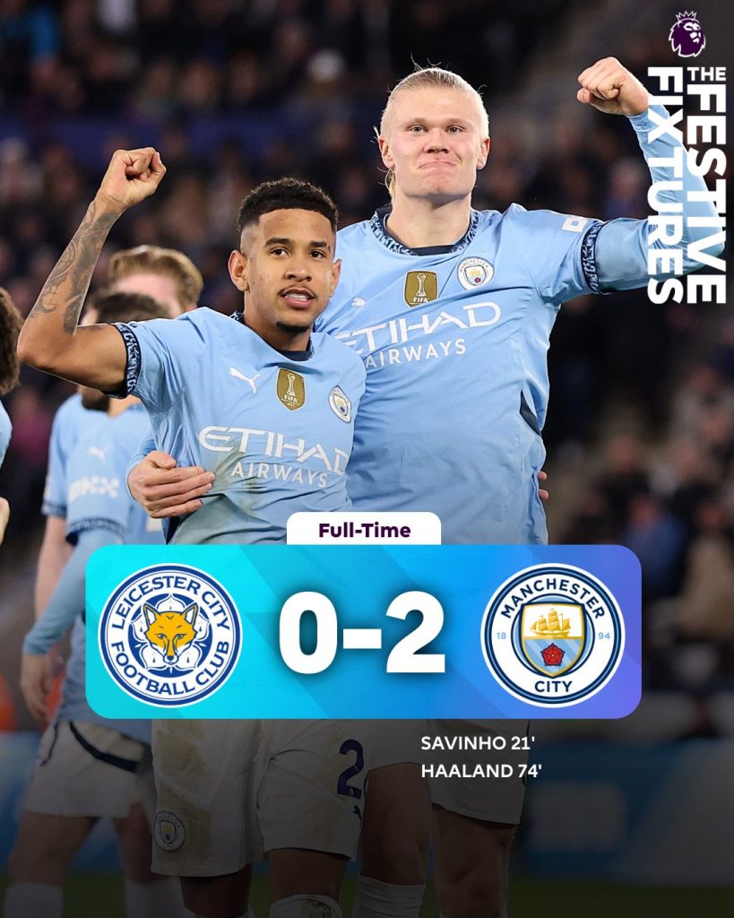 City sealed the victory in the 74th minute when Savinho delivered a perfect cross for Haaland, who headed home for his first goal in five games, ending his scoring drought. Vardy struck the crossbar late on, but City held firm to secure three points.