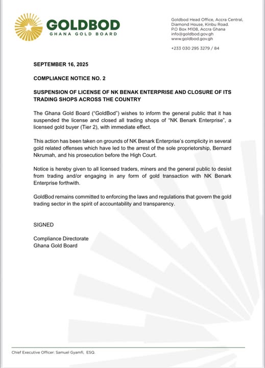 The Ghana Gold Board (GoldBod) has suspended the license of NK Benak Enterprise, a licensed gold buyer (Tier 2), and ordered the immediate closure of all its trading shops across the country.