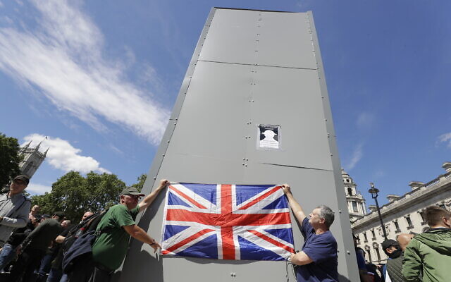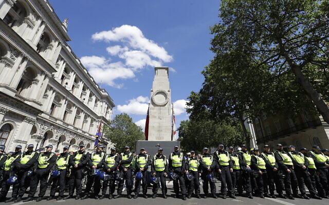 Many of the right-wing supporters gathered around the statue of wartime Prime Minister Winston Churchill and the Cenotaph war memorial, which both were boarded up Friday to protect them from vandalism. Officials put protective panels around the monuments amid fears of vandalism.
