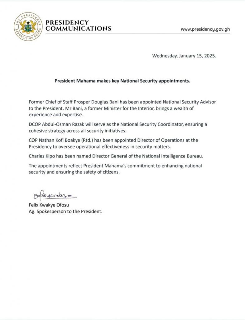 Additionally, DCOP Abdul-Osman Razak has been appointed National Security Coordinator, tasked with coordinating and ensuring the effectiveness of the country’s security strategies.