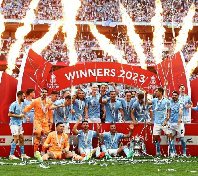 Manchester City moved to within one victory of completing an historic Treble as they beat Manchester United 2-1 in the FA Cup final thanks to Ilkay Gundogan’s double on Saturday.