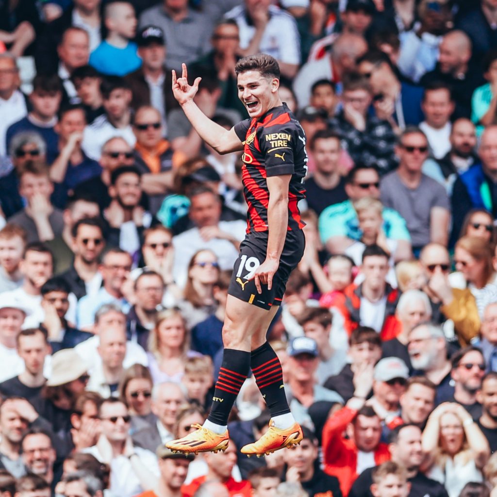 Jack Grealish was denied by the crossbar before Argentine forward Julian Alvarez produced a moment of magic to beat Bernd Leno with a right-footed shot from outside the area.