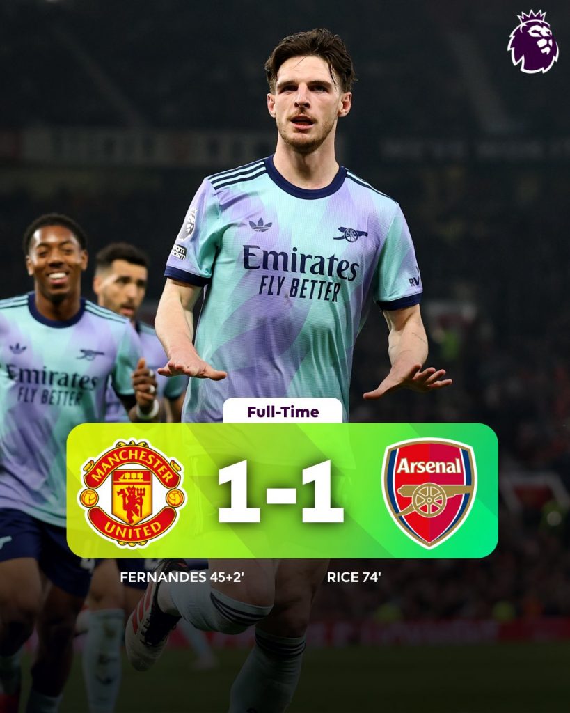 Bruno Fernandes had put United in the lead with a stunning free-kick in first-half stoppage time, but they were unable to hold on for just their sixth Premier League win under Amorim. Rice leveled the score 16 minutes into the second half, ensuring the match ended in a draw, leaving United in 14th place.