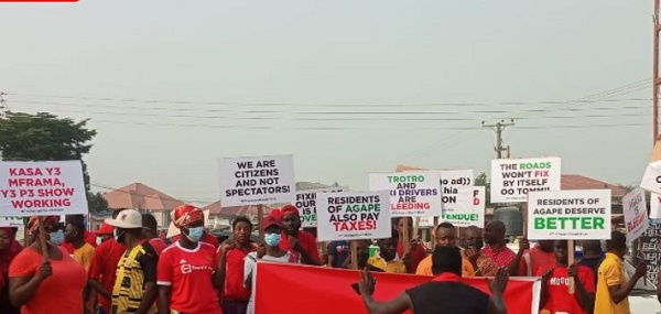 The all-red-clad demonstrators wielded placards with messages such as: “We’re tired of the promises”, “We are part of Ghana”, “#FixAgapeRoadsNow”, “Residents of Agape also pay taxes”, “Residents of Agape deserve better”, “We are citizens and not spectators”, “Agape lives matter”, among others.