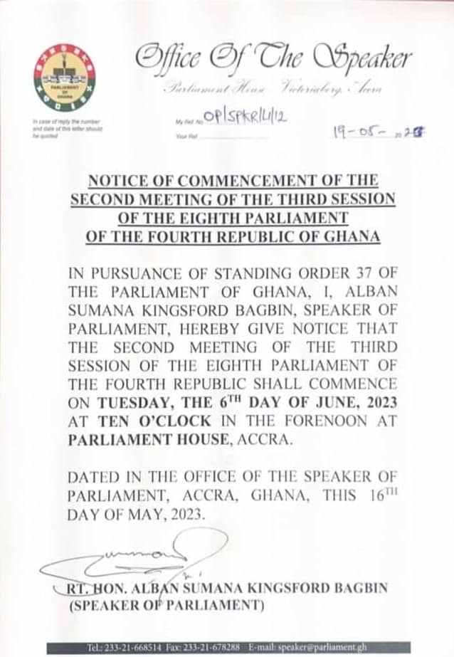 The Speaker of Parliament, Alban Sumana Bagbin in a statement recalling the MPs for the Second Meeting of the Third Session of the Eighth Parliament said the House will commence proceedings at 10:00am.