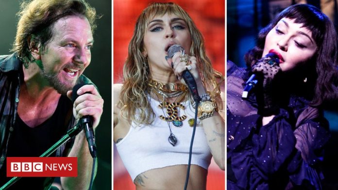 Pop stars Miley Cyrus and Madonna and rock band Pearl Jam have called off concerts as the impact of coronavirus begins to hit live music.