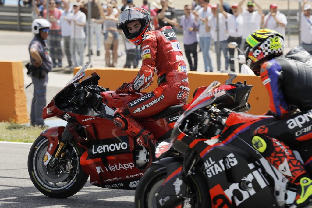 Aprilia’s Aleix Espargaro overcame a slow start to secure third while six-times MotoGP world champion and local favourite Marc Marquez held off Bagnaia’s team mate Jack Miller to take fourth.