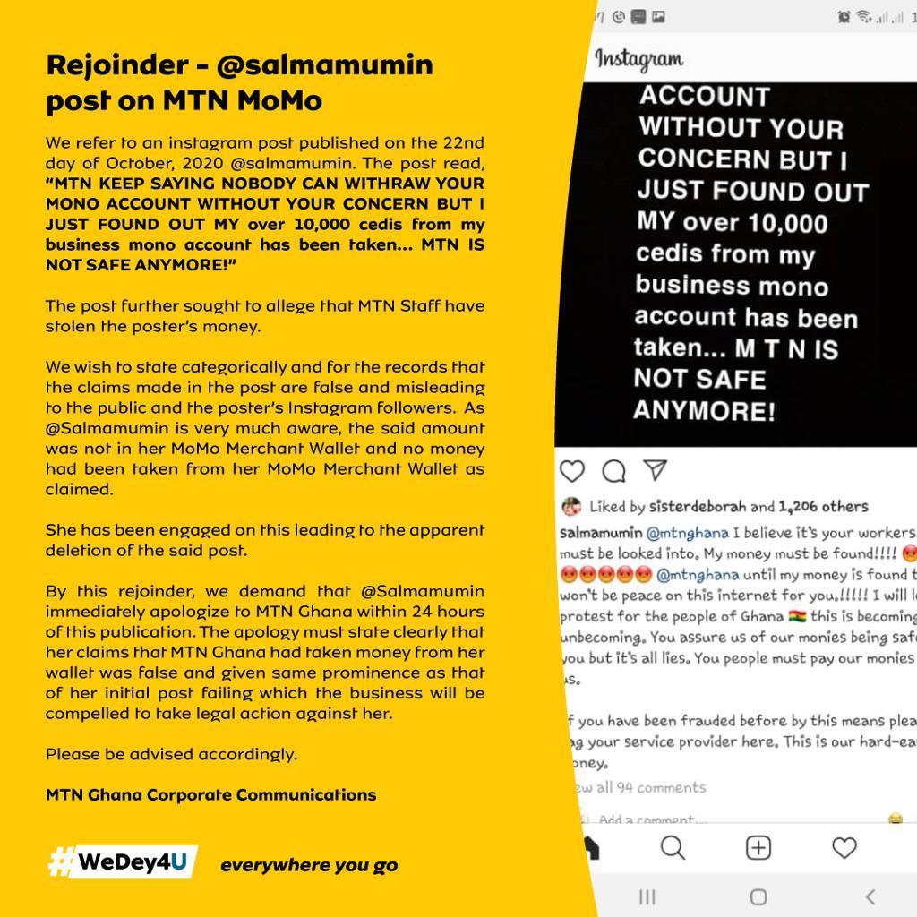 “The apology must state clearly that her claim that MTN Ghana had taken money from her wallet was false and given some prominence as that of her initial post failing which the business will be compelled to take legal action against her,” MTN demanded.