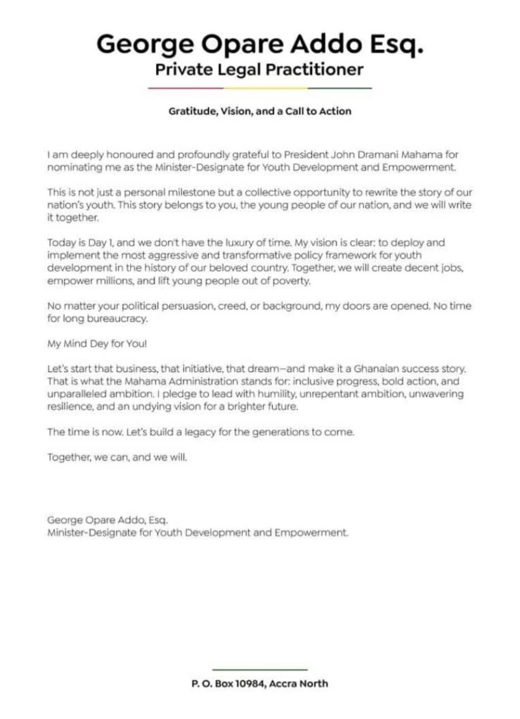 George Opare Addo, the Minister-Designate for Youth Development and Empowerment, has expressed his sincere gratitude to President John Dramani Mahama for his nomination. He vowed to approach his new role with humility and a clear vision for the future of Ghana’s youth.