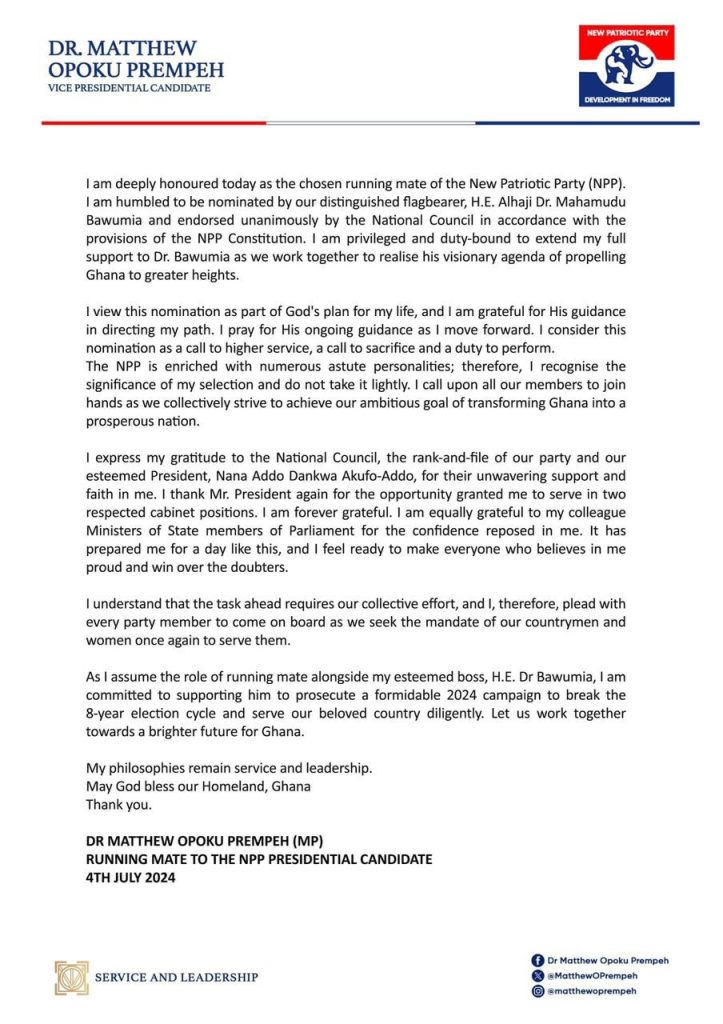 “As I assume the role of running mate alongside my esteemed boss, H.E. Dr. Bawumia, I am committed to supporting him to prosecute a formidable 2024 campaign to break the 8-year election cycle and serve our beloved country diligently. Let us work together towards a brighter future for Ghana,” he stated.