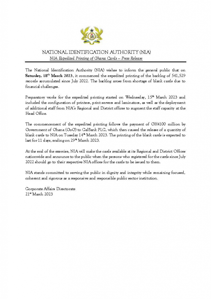 “The National Identification Authority (NIA) wishes to inform the general public that on Saturday, 18th March 2023, it commenced the expedited printing of the backlog of 541,529 records accumulated since July 2022.