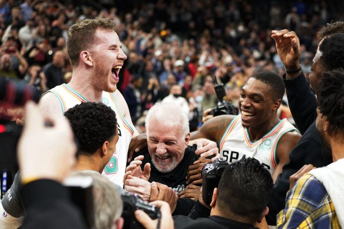 San Antonio coach Gregg Popovich is not one to call attention to himself, but his players made sure he basked in the limelight for at least a few minutes after he became the NBA’s all-time leader in regular-season coaching wins Friday night.