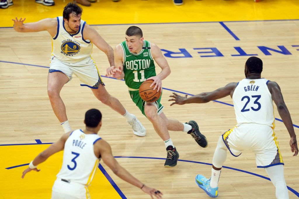 The Celtics started the contest right where they left off at the end of Game One, using their superior size to frustrate Warriors shooters and swishing threes to take an early nine-point lead.