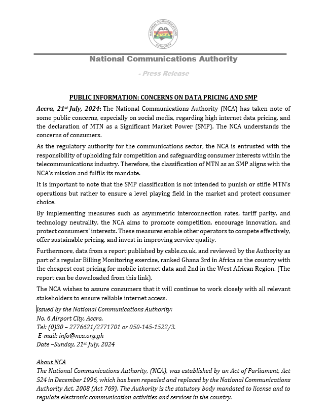 The Authority also pointed to a cable.co.uk publication that ranked Ghana 3rd in Africa for having the lowest mobile internet data prices. The NCA noted that the report also ranked Ghana 2nd in the West African region.