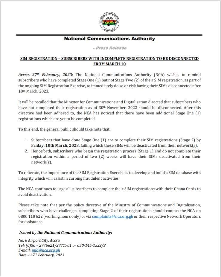 “The National Communications Authority (NCA) wishes to remind subscribers who have completed stage one (1) but not stage two (2) of their SIM registration, as part of the ongoing SIM registration exercise, to immediately do so or risk having their SIMs disconnected after 10th March 2023,” NCA said in a statement.