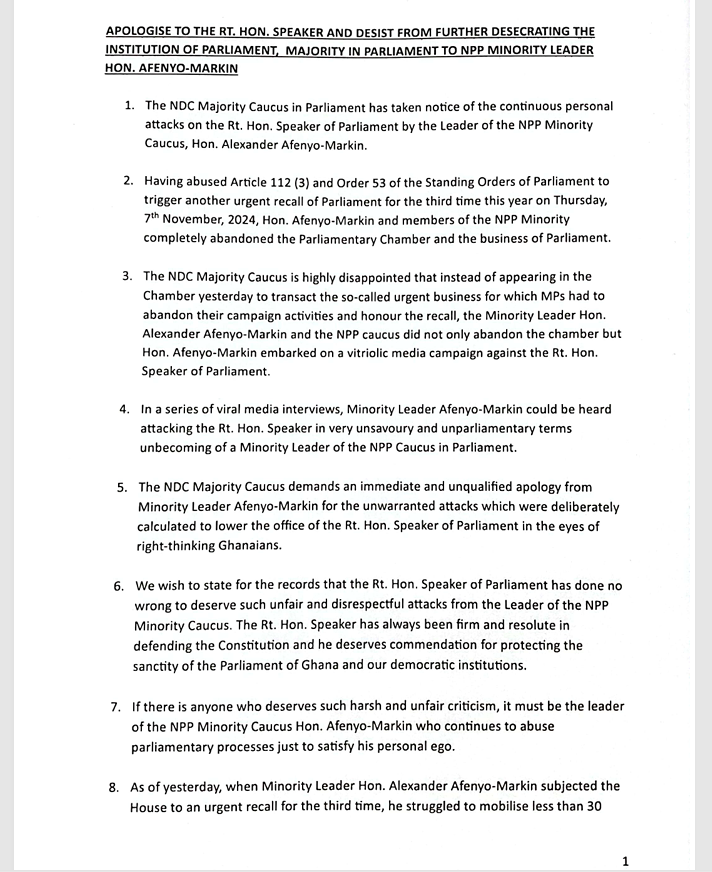 The NDC caucus demanded an “immediate and unqualified apology,” arguing that such attacks disrespected the Speaker’s office and undermined its authority.