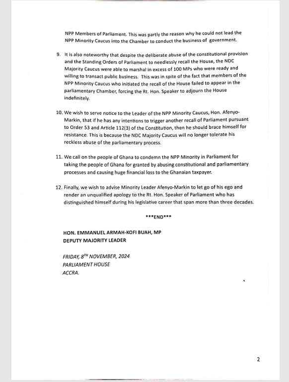 In response, the NDC caucus issued a statement on Friday, November 8, signed by Deputy Minority Leader Emmanuel Armah-Kofi Buah, condemning Afenyo-Markin’s remarks as “unparliamentary” and “unsavory.”