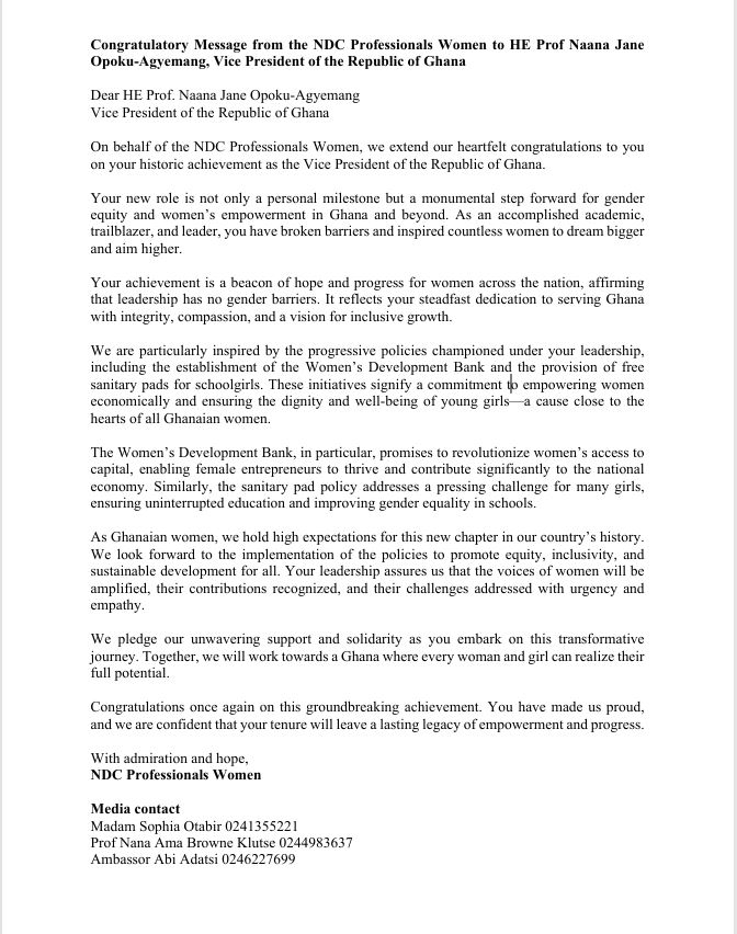 The National Democratic Congress (NDC) Professionals Women have extended warm congratulations to Naana Jane Opoku-Agyemang, the first female Vice President of the Fourth Republic, on her historic achievement.