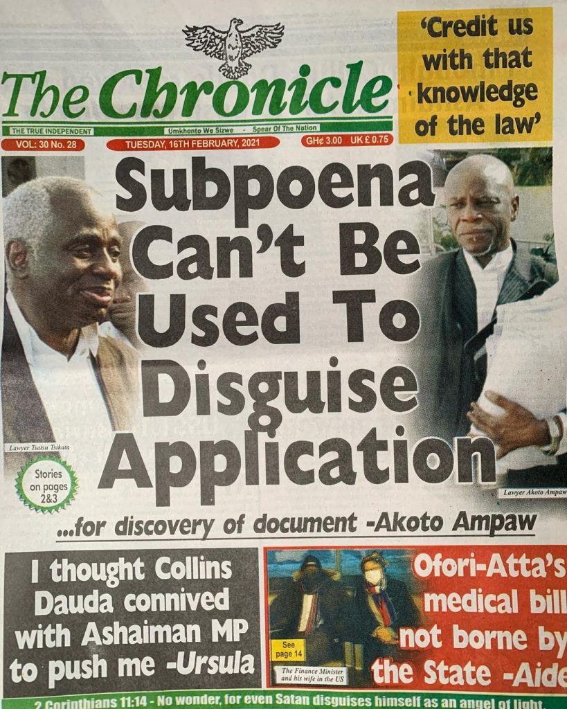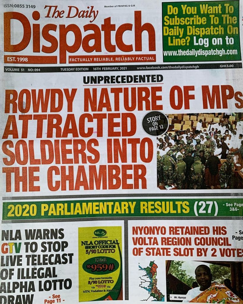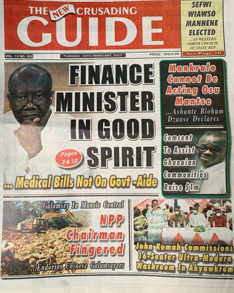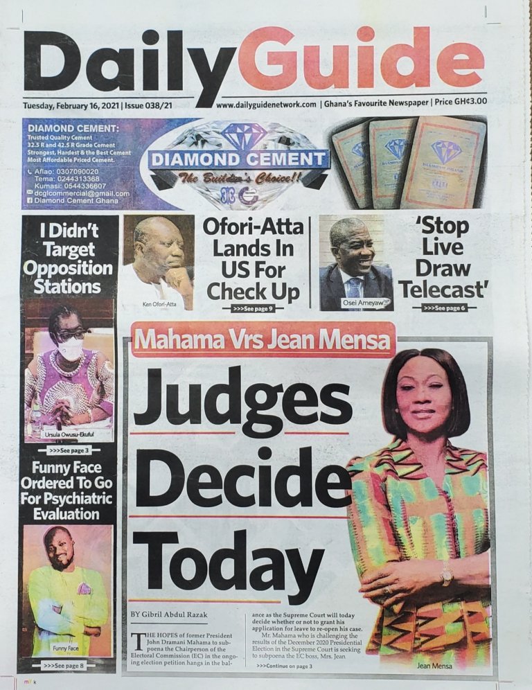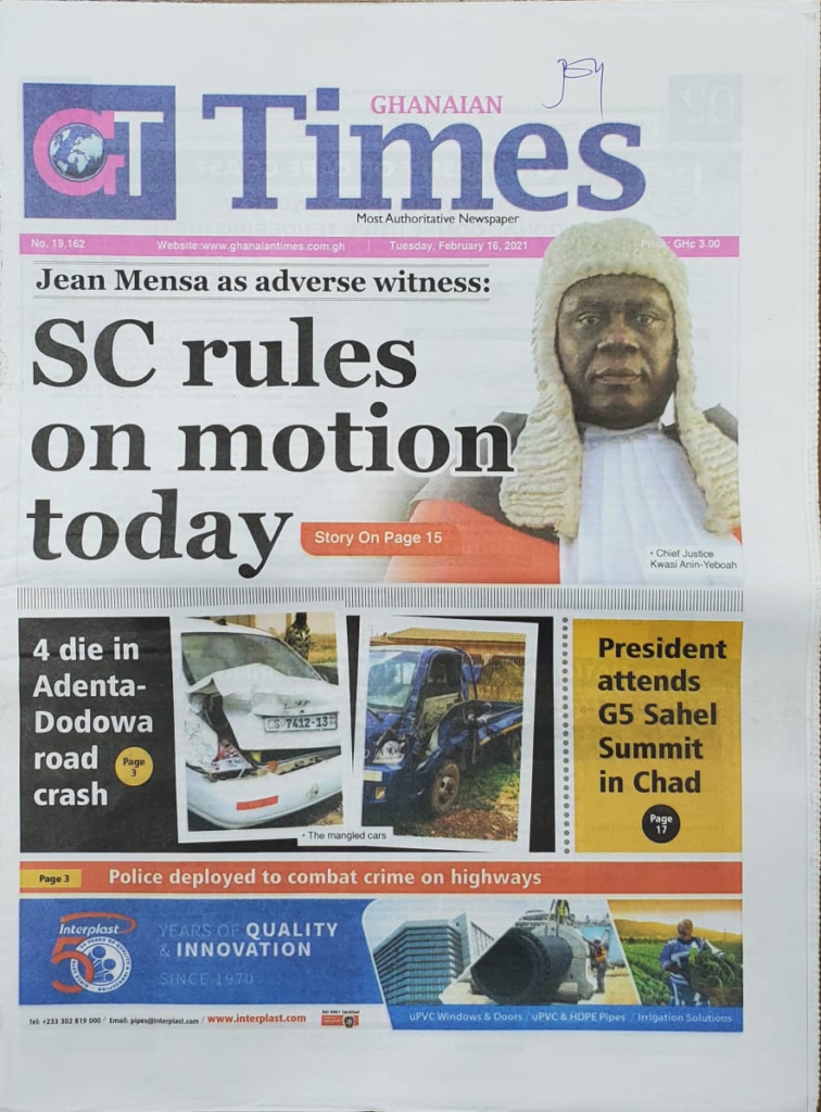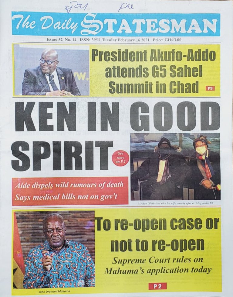 NewsGhana Newspaper Newspaper Headlines: ‘KEN IN GOOD SPIRIT’ 16th February 2021 0 478 Share Facebook Twitter WhatsApp Linkedin Pinterest Telegram Viber Ghana Newspaper Headline for today: Wednesday, February 16, 2021.