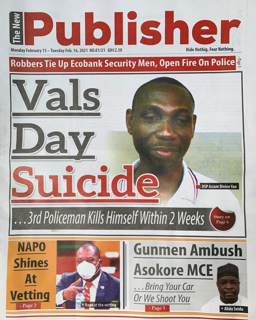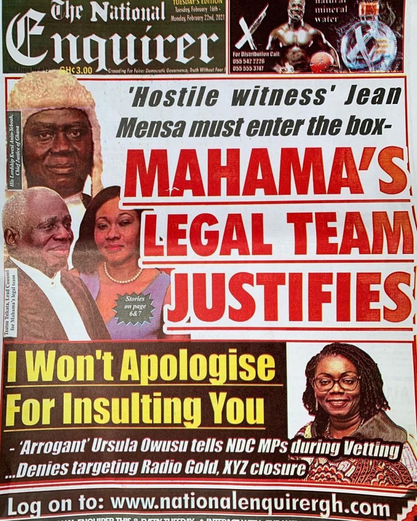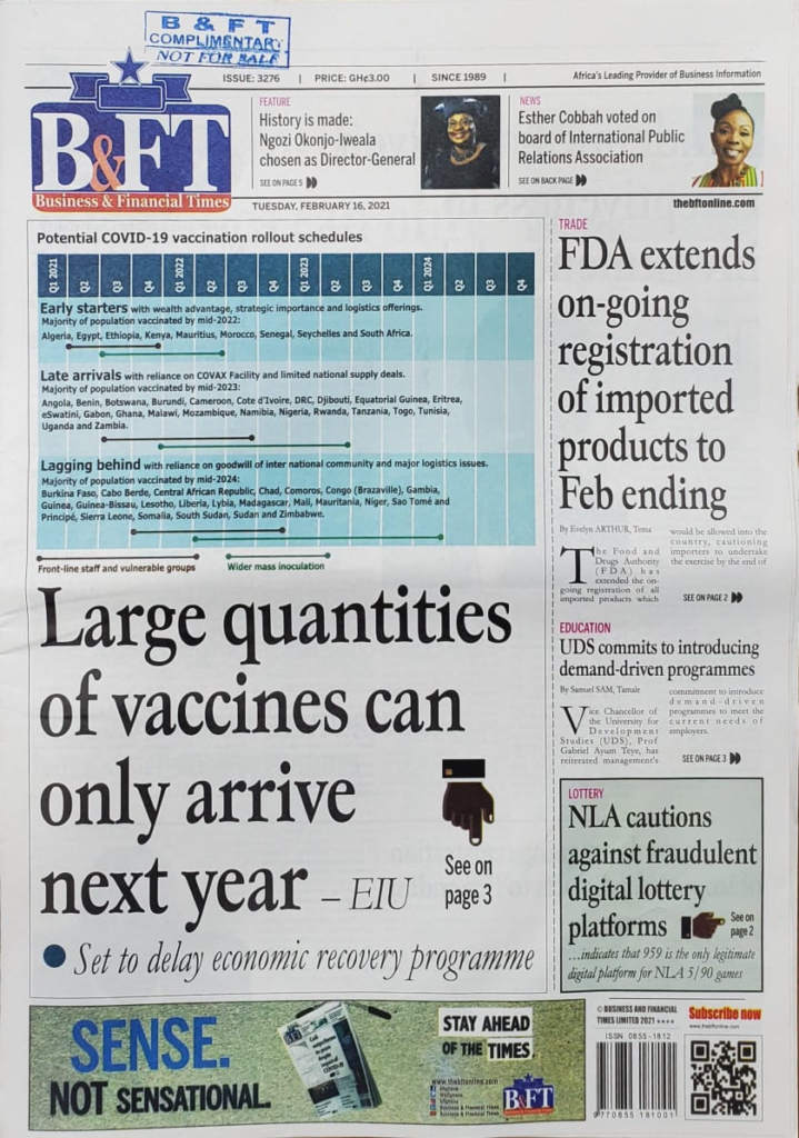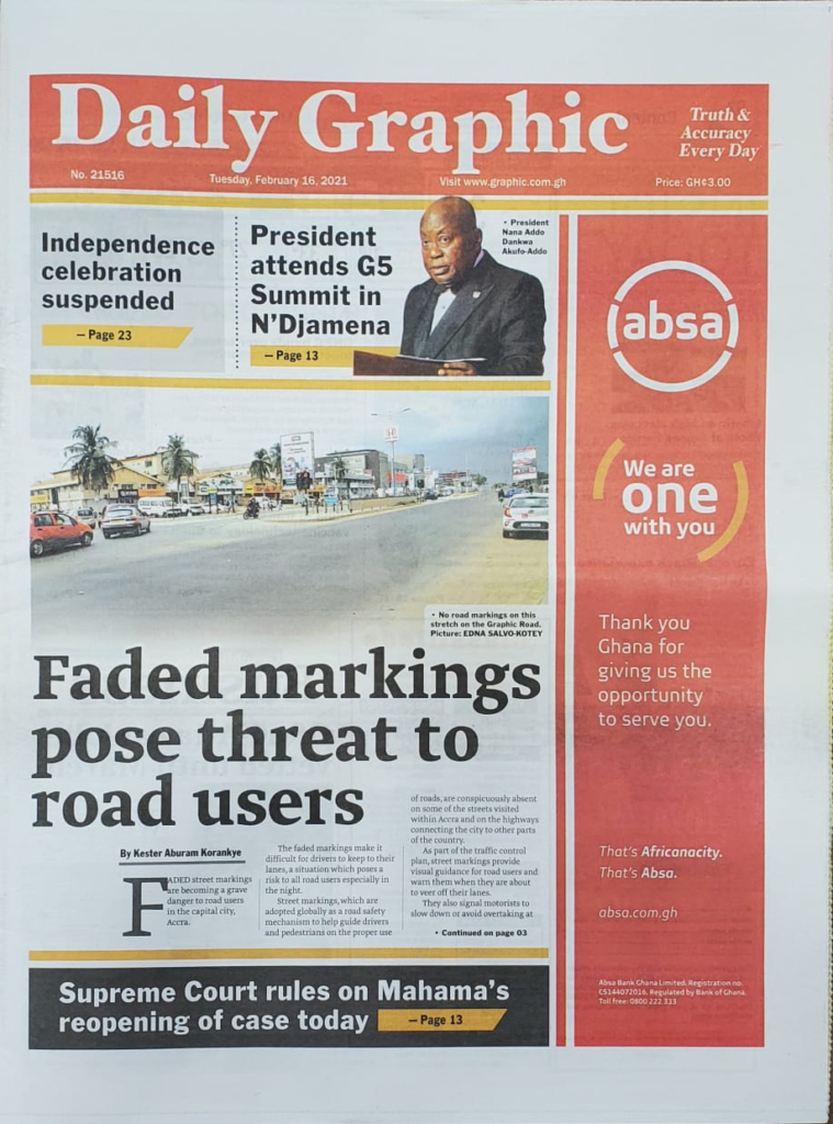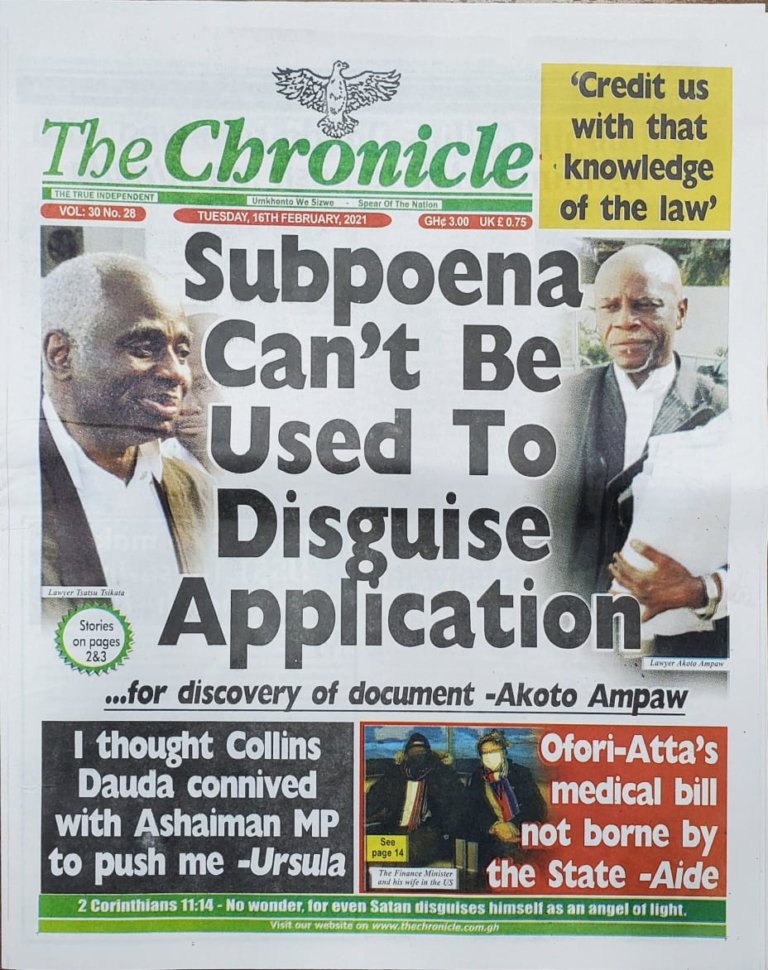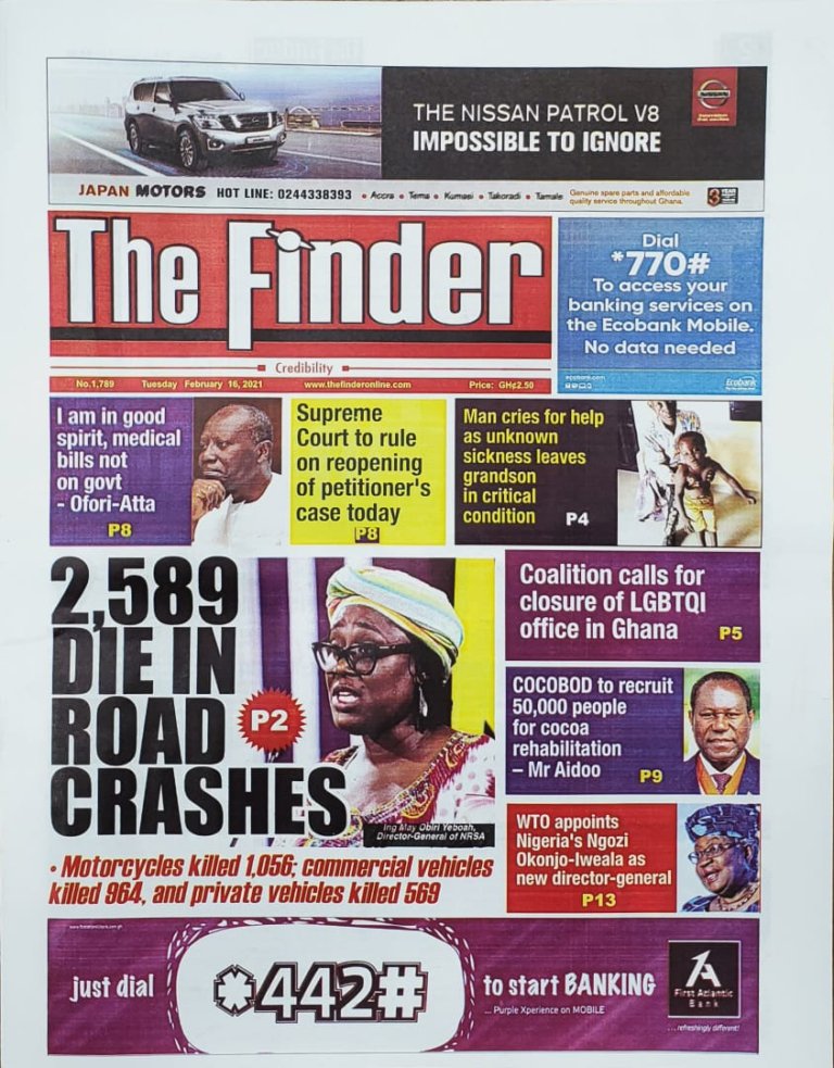 NewsGhana Newspaper Newspaper Headlines: ‘KEN IN GOOD SPIRIT’ 16th February 2021 0 478 Share Facebook Twitter WhatsApp Linkedin Pinterest Telegram Viber Ghana Newspaper Headline for today: Wednesday, February 16, 2021.