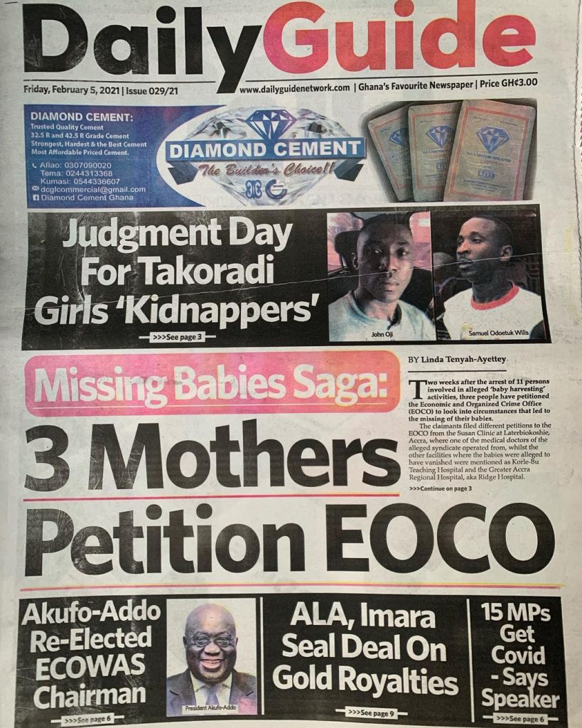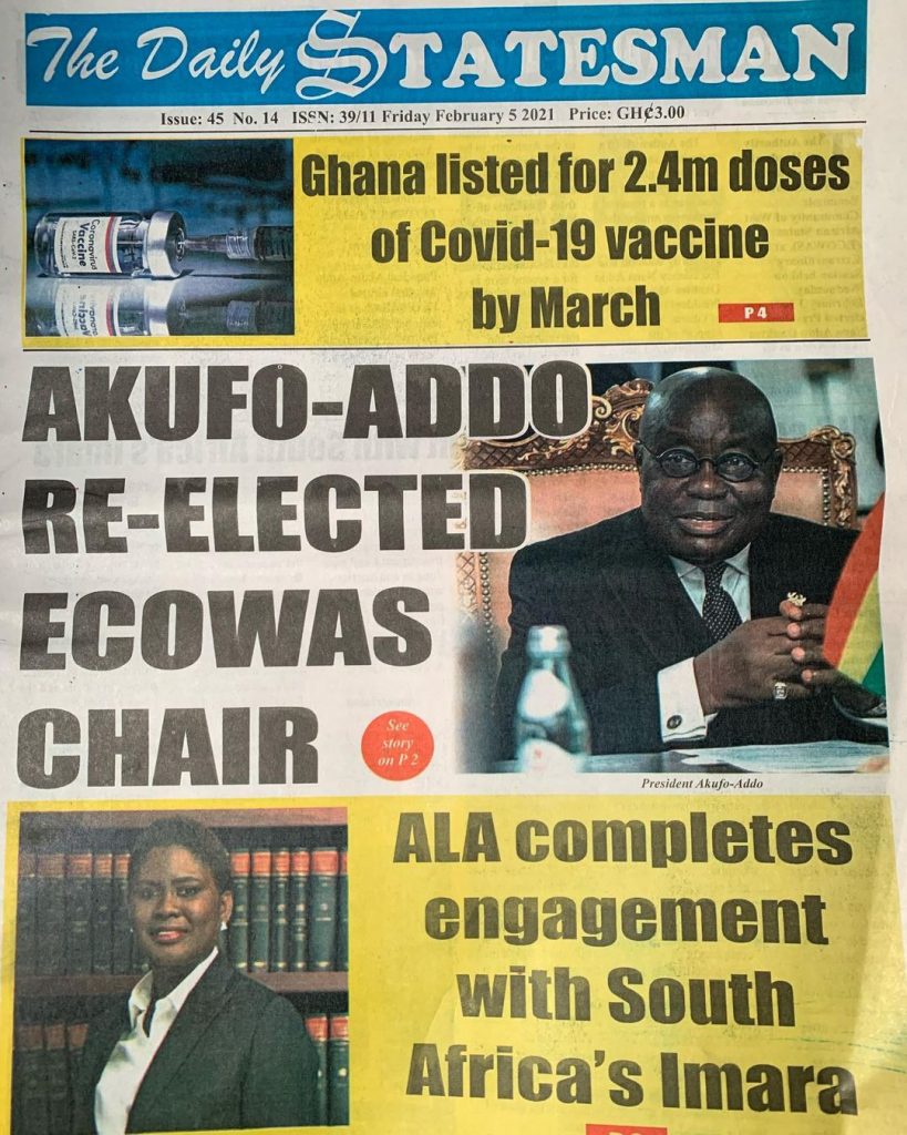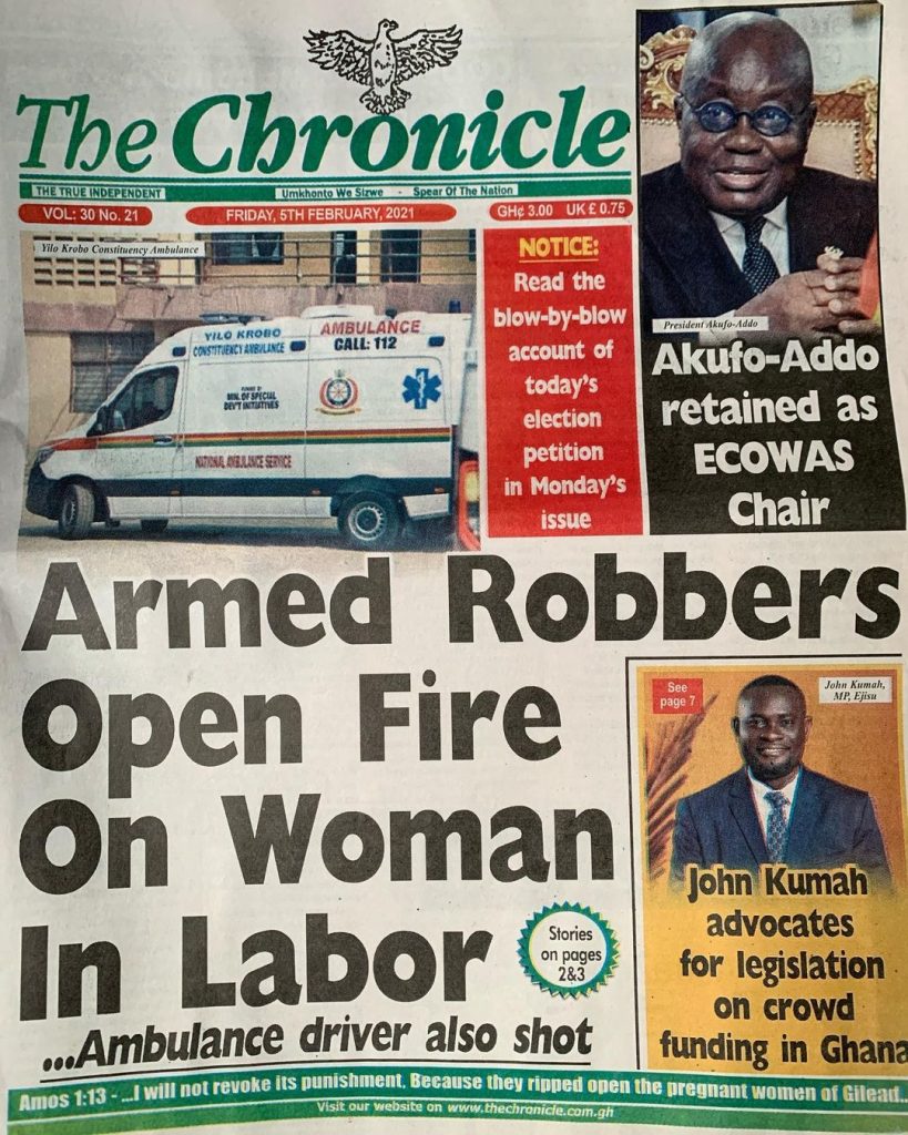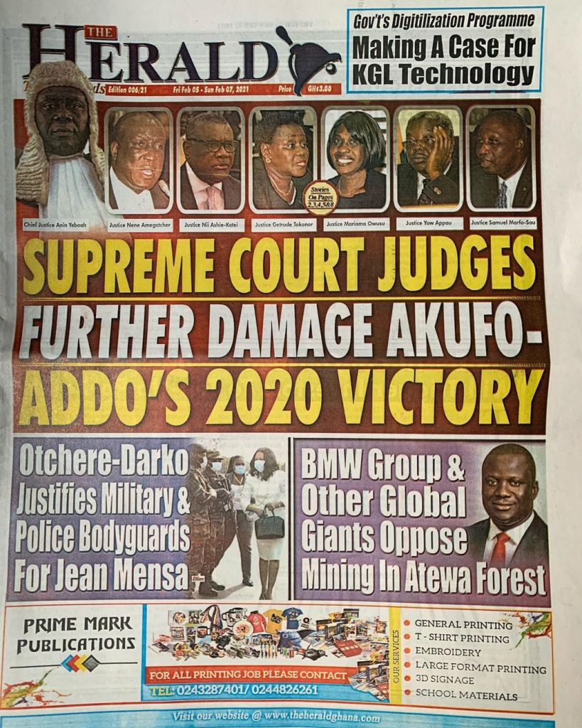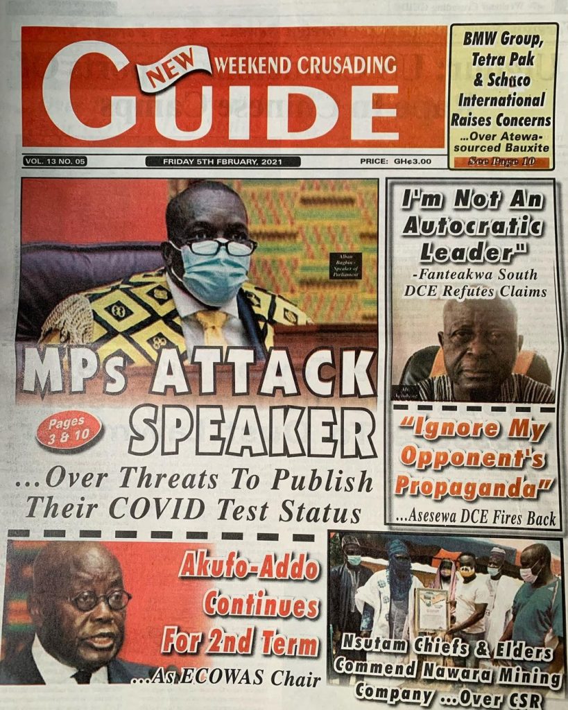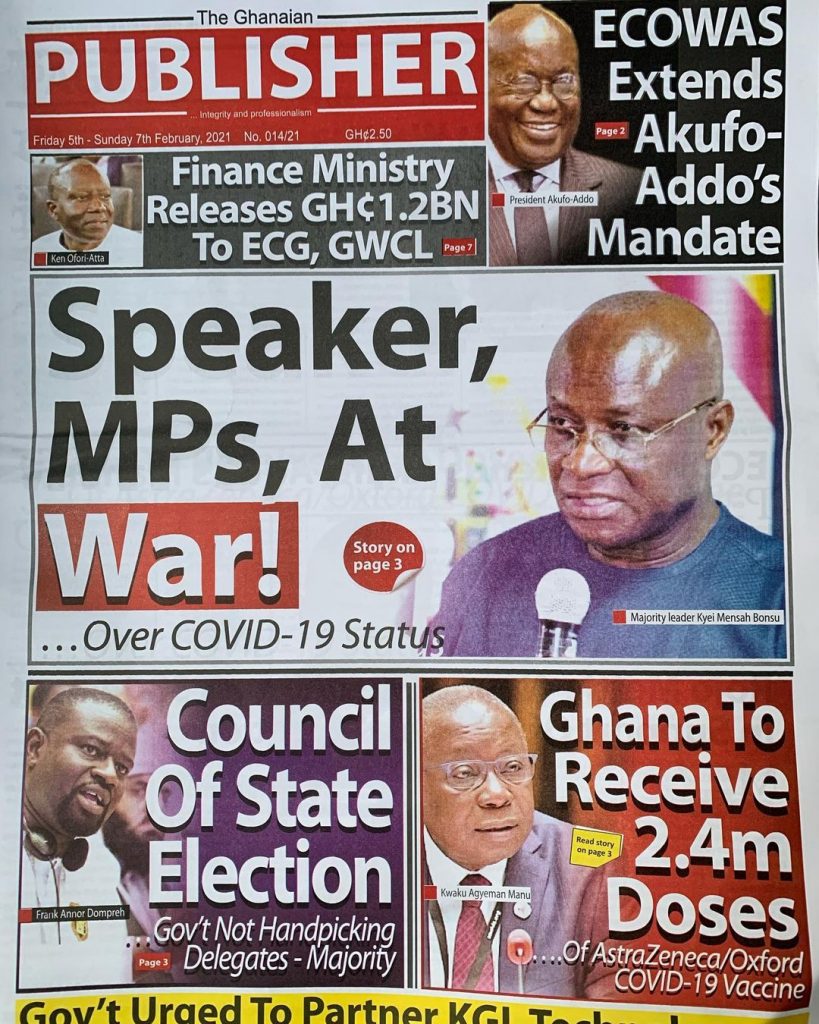 NewsGhana Newspaper Newspaper Headlines: ‘MPs ATTACK SPEAKER’ 5th February 2021 0 543 Share Facebook Twitter WhatsApp Linkedin Pinterest Telegram Viber Ghana Newspaper Headline for today: Wednesday, February 05, 2021.