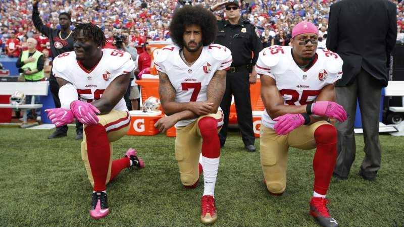 Kneeling for the anthem, a practice started by ex-San Francisco 49er Colin Kaepernick, was banned in May 2018, with the policy put on hold in July.