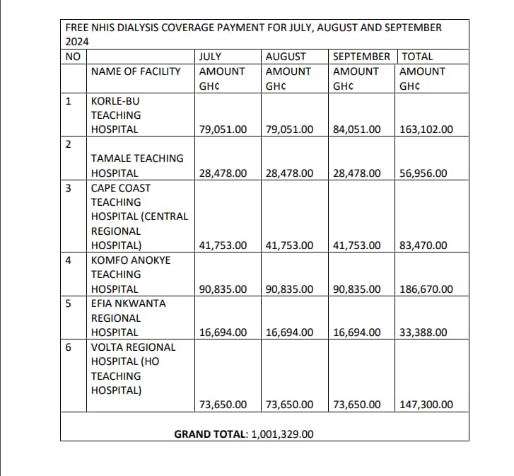 The latest payment of GH¢1,001,329.00 will cover the cost of dialysis services at health facilities for July and August and includes an advance for September.