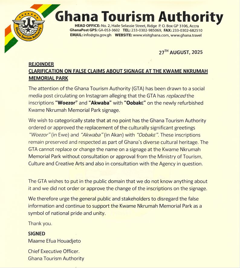The Ghana Tourism Authority (GTA) has firmly dismissed claims circulating on social media that culturally significant greetings on the signage at the newly refurbished Kwame Nkrumah Memorial Park have been replaced with unfamiliar inscriptions.