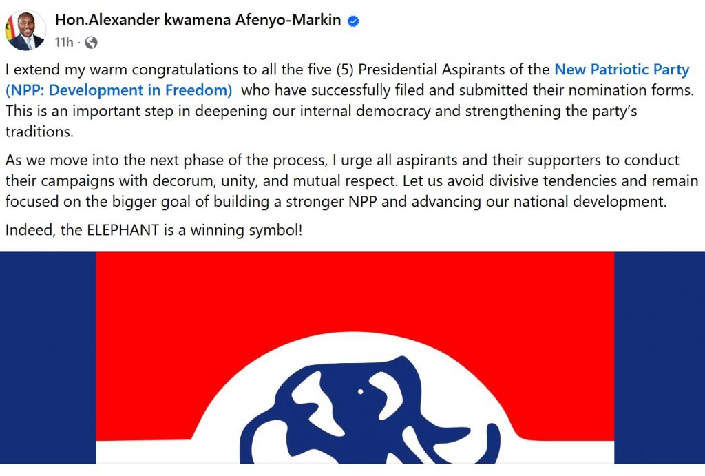 In a Facebook post shared on Thursday, August 28, Afenyo-Markin praised the aspirants for what he described as a “significant step” in strengthening the NPP’s democratic traditions and reaffirming its commitment to transparent leadership selection.