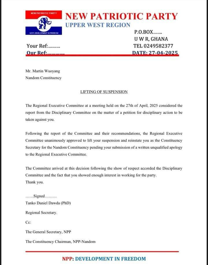 In a statement issued the same day, the Upper West Regional NPP explained that the reinstatement was a result of Wuoyang’s respectful engagement with the party’s structures and his willingness to serve.