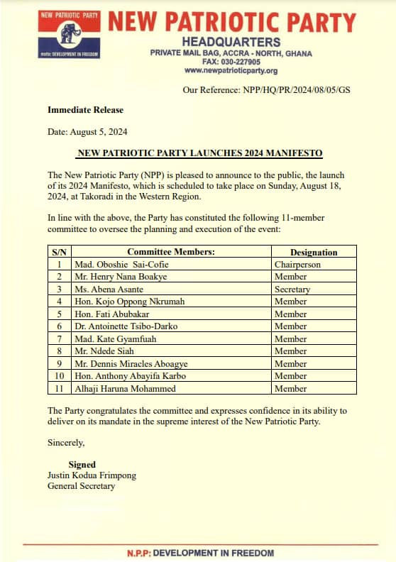 The New Patriotic Party (NPP) will launch its 2024 Manifesto on Sunday, August 18, 2024, in Takoradi, Western Region.