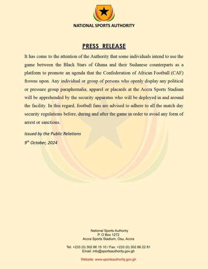 “Any individual or group of persons who openly display any political or pressure group paraphernalia, apparel or placards at the Accra Sports Stadium will be apprehended by the security apparatus who will be deployed in and around the facility.