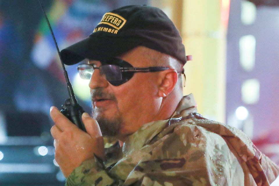Rhodes, who wears an eye patch after accidentally shooting himself in the face with his own gun, founded the Oath Keepers in 2009.
