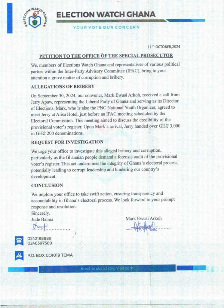 Mark Ewusi, Convenor of Election Watch Ghana and National Youth Organizer for the People’s National Convention (PNC), has petitioned the Office of the Special Prosecutor (OSP) to investigate allegations of bribery during the recent Inter-Party Advisory Committee (IPAC) meeting held by the Electoral Commission on October 1.