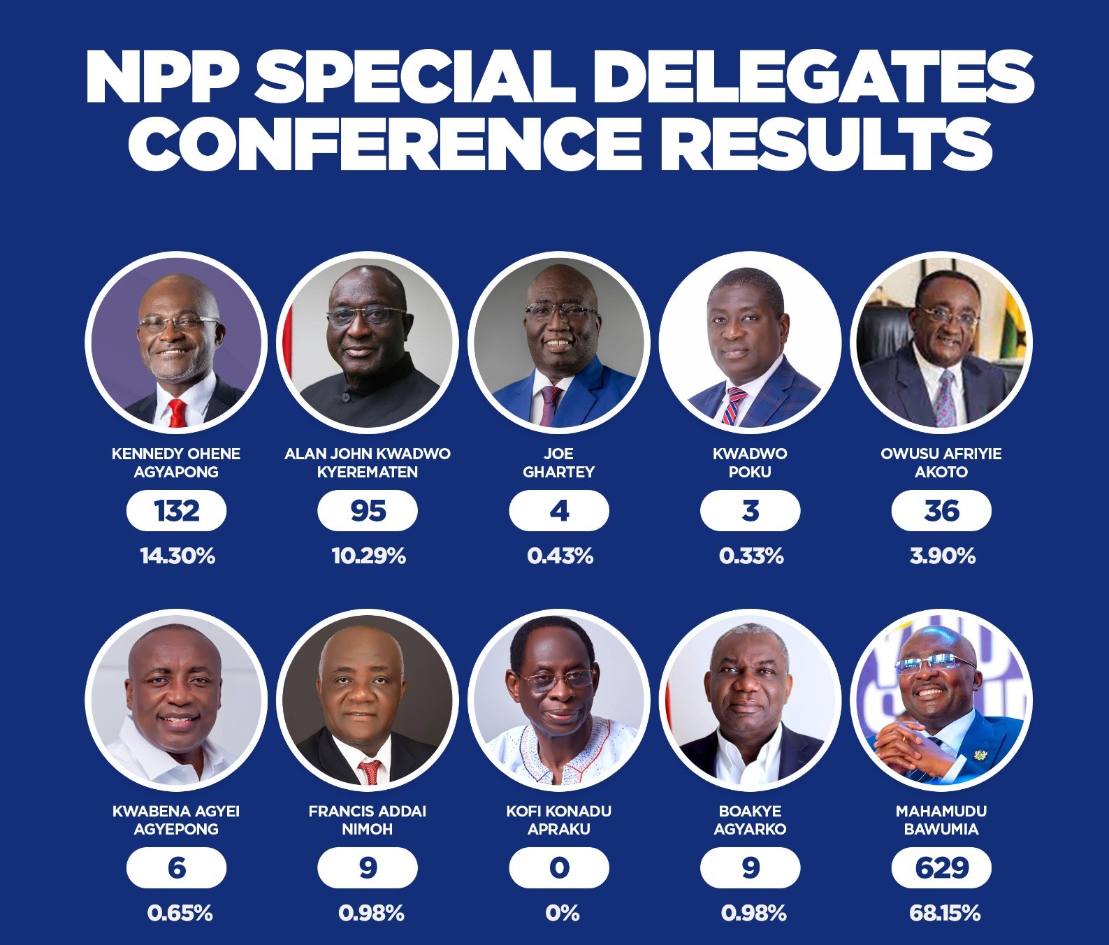 Vice President Dr. Mahamudu Bawumia won the New Patriotic Party (NPP) super delegates conference with a total of 629 votes, representing 68.15% of the vote.