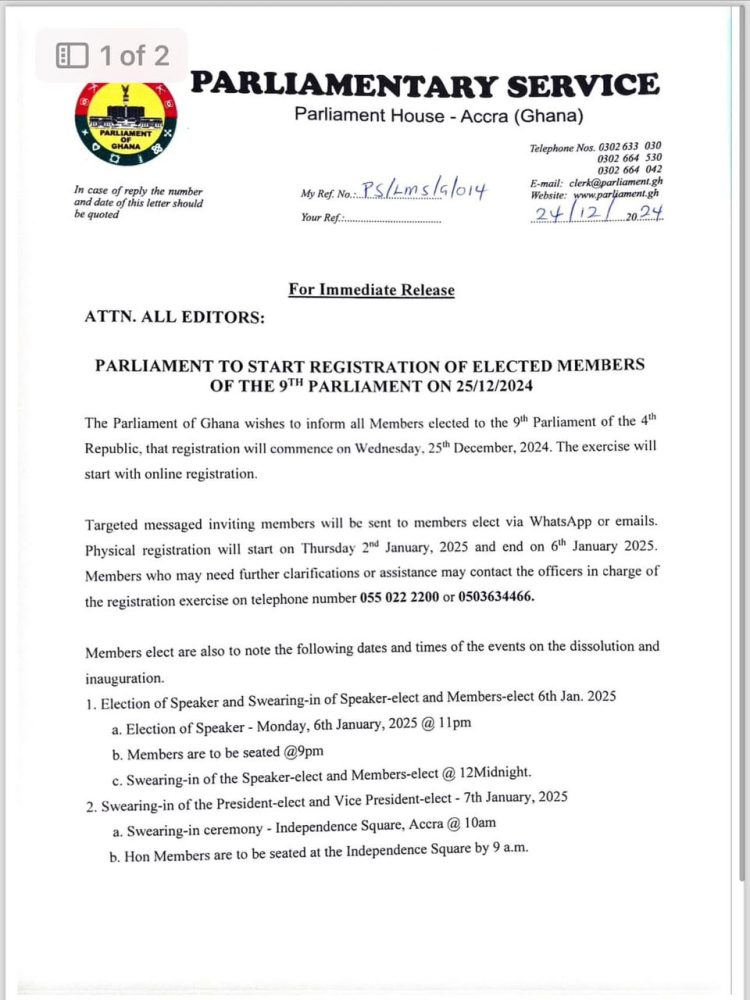 Parliament has officially initiated the registration process for Members of Parliament-elect for the upcoming 9th Parliament of the 4th Republic.